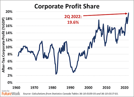 Because amid all this suffering — what we’ve been through and what’s to come — there is one statistic that marches ever upward: corporate profits. Banks, insurance companies and oligopolies in telecoms, oil and gas, groceries and pharmaceuticals just keep raking in record-breaking profits. Quarter after quarter, year after year, at every stage of the business cycle.